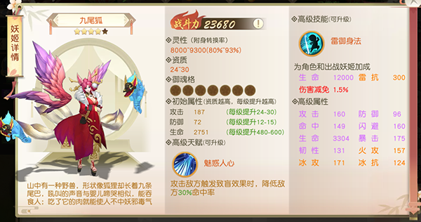 九尾狐作为四星妖姬之一,其属性自然也不会差。初始战斗力就达到了:23680,灵性(附身转换率):8000~9300(80%-93%),资质24~30,御魂格有7格。,妖姬品质越高,天命越强。